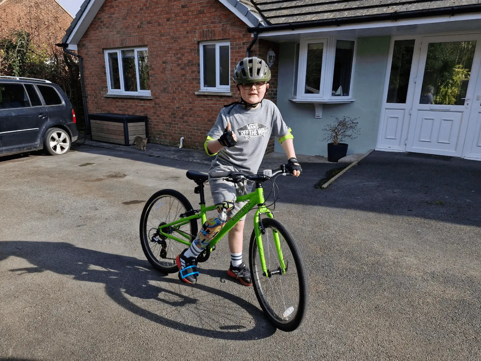 Frazer Tait on his bike after the fitting of his prosthetic right leg.